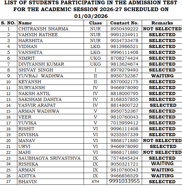 RESULT OF STUDENTS PARTICIPATING IN THE ADMISSION TEST FOR THE ACADEMIC SESSION 2026-27 SCHEDULED ON 01/03/2026