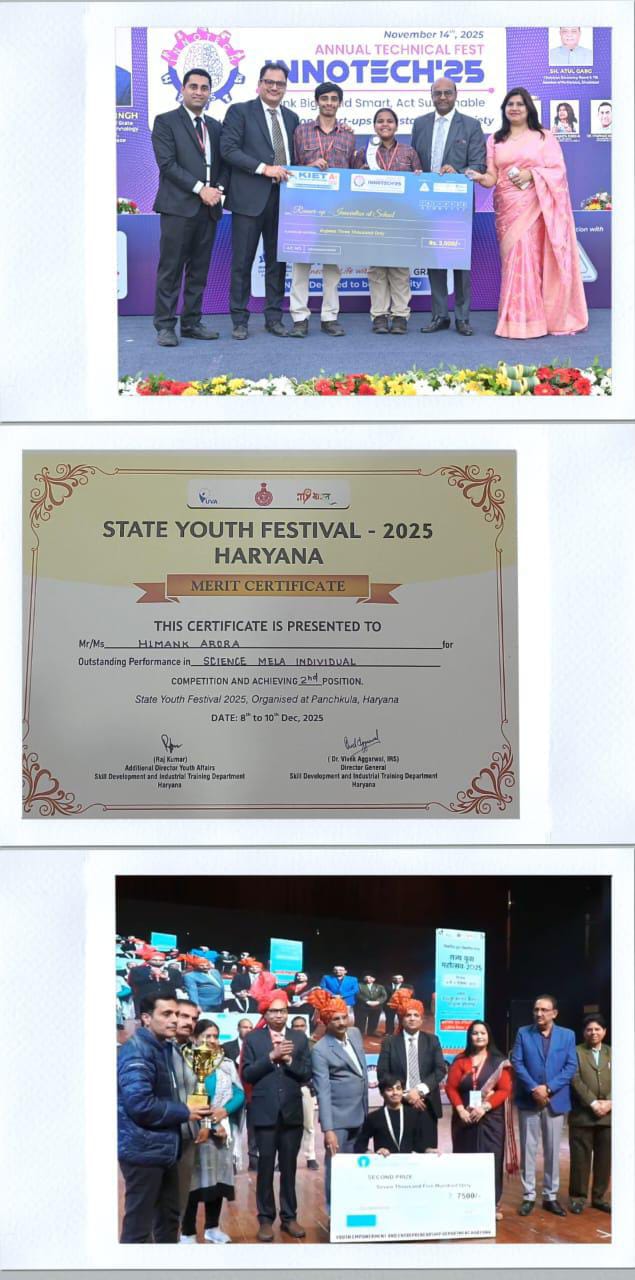 Adding another feather to his cap, the same project also secured 2nd Prize at KIET Innotech 2025 on 14th November 2025, winning a trophy and a cash prize of ₹3,000.